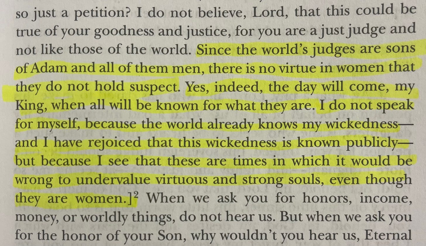 Teresa was born on March 28, 1515, in Ávila, Spain. An Aries, like me. Her editors were called censors. The vibe of this era was that a woman should leave her house three times — to be baptized, to be married, to be buried. A skeptical environment to write in, particularly as a woman and especially for a mystic. She’s aware of this and in The Book of My Life her self deprecation is, to me, insufferable. The Way of Perfection was written four years later, and edited (censored) by a less strict Spanish friar. “What is the matter with Christians nowadays?” she boldly asks in Chapter 1.