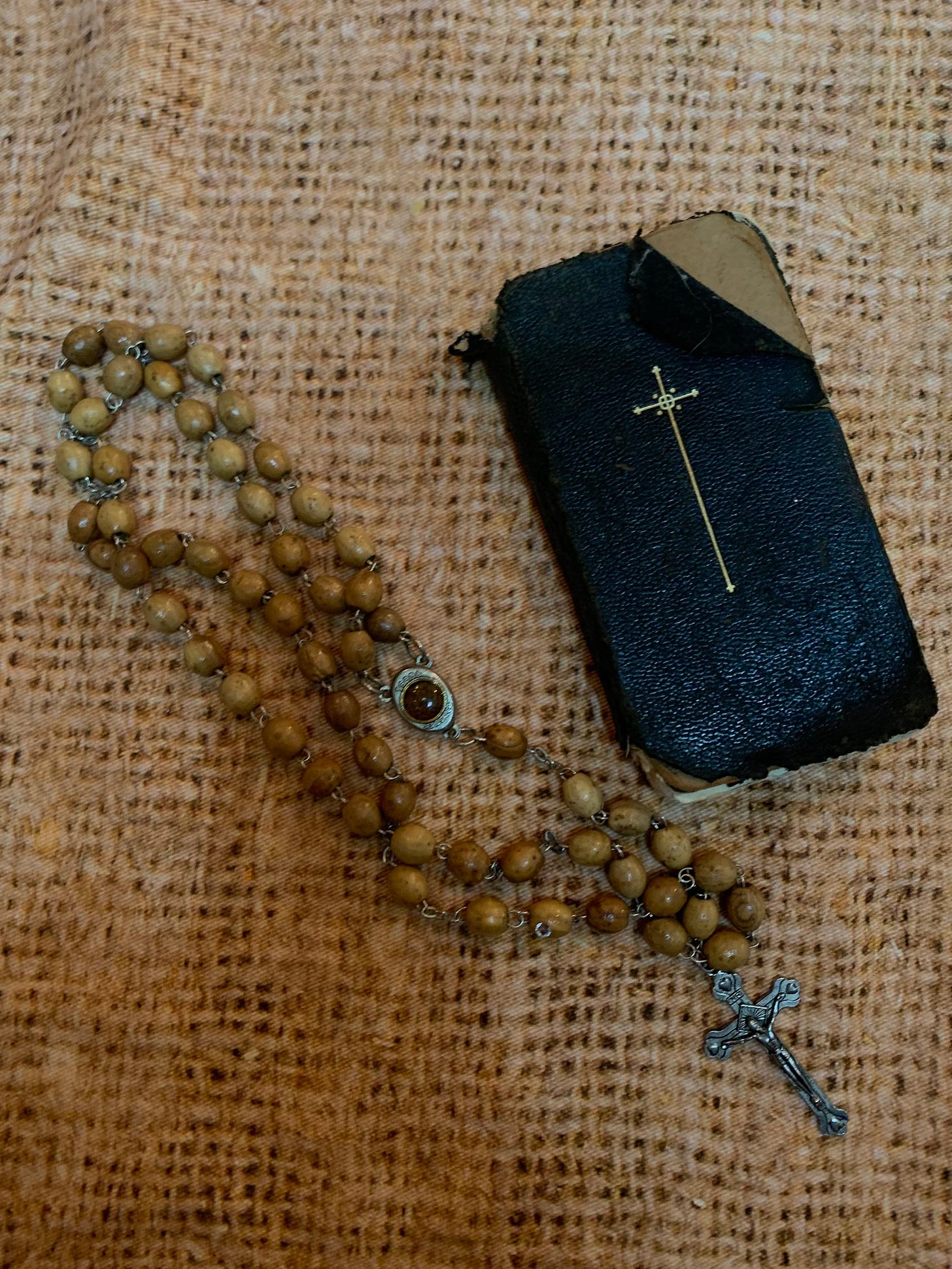 The Kindle is replaceable, the rosary is not. Its pendant, where my thumb rests as I pray, holds tiny specks of dirt encased in glass. Beneath the soil, it says Jerusalem. I always have it on hand while traveling — reinforcements are essential in this post-pandemic hellish airport landscape, not to mention the toddler in tow. Last year, when I showed it to my cousin he ran to his car to show me her prayer book. It’s 100 years old — all the prayers are in Spanish even though her native tongue was Arabic. We remain incredibly attached to her, and each other. His name is Alex. In another life, we were siblings, and she was our mother. Madre.