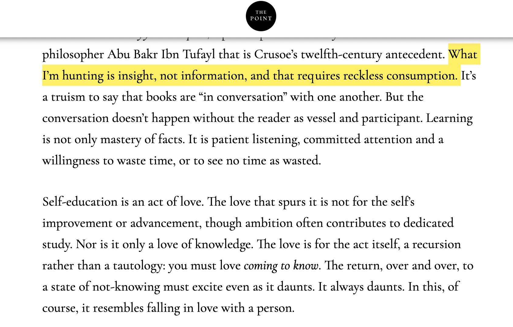 I stumble upon The Point’s latest issue, an essay titled Schooling Myself.