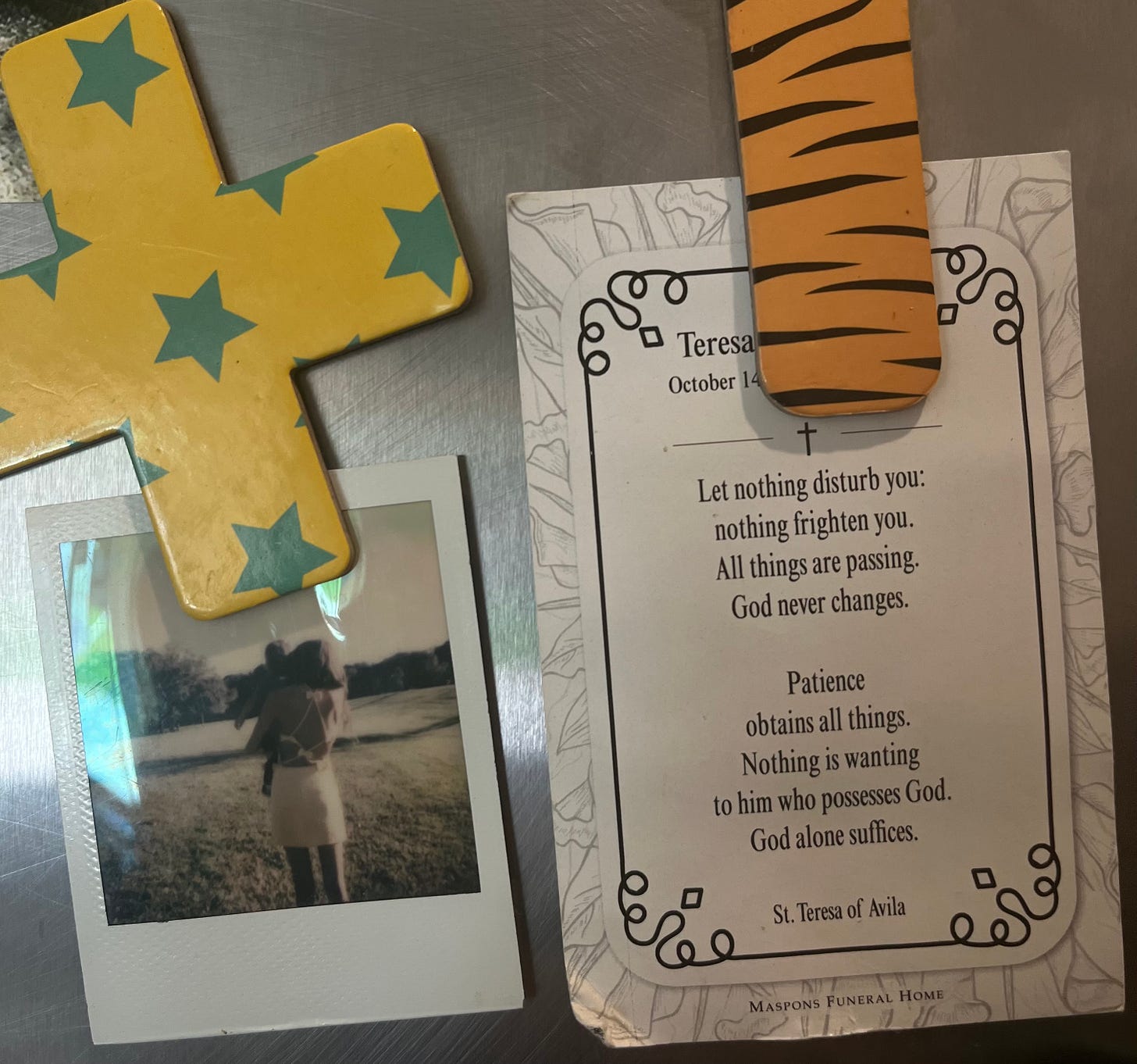 It was on the same trip to New York, last September, where she found me again. I was rummaging through an old bag of mine, in my old room in Brooklyn, when I found a prayer card with her face on it, from a funeral I never attended. I took a picture of the prayer on the back of the card, made it my phone background, and put it on the fridge when we got back to Cabo.